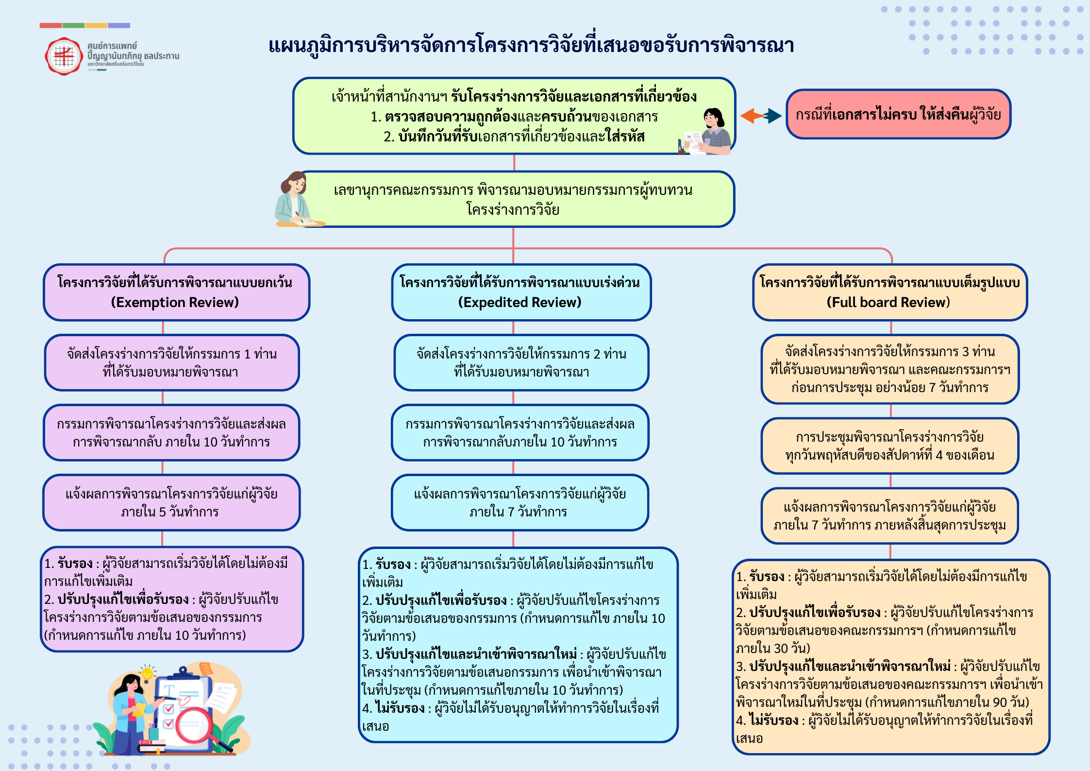 การขอทำวิจัยในศูนย์การแพทย์ปัญญานันทภิกขุ ชลประทาน โครงการวิจัยที่ส่งภายในวันพุธ สัปดาห์ที่ 2 ของเดือนและเข้าข่ายการพิจารณาแบบ Full Board จะได้รับการนำเข้าที่ประชุมพิจารณาในวันพฤหัสบดี สัปดาห์ที่ 4 ของเดือนนั้น สำหรับโครงการวิจัยที่ส่งหลังวันพุธ สัปดาห์ที่ 2 และเข้าข่ายการพิจารณาแบบ Full Board จะได้รับการนำเข้าที่ประชุมพิจารณาในรอบการประชุมของเดือนถัดไป