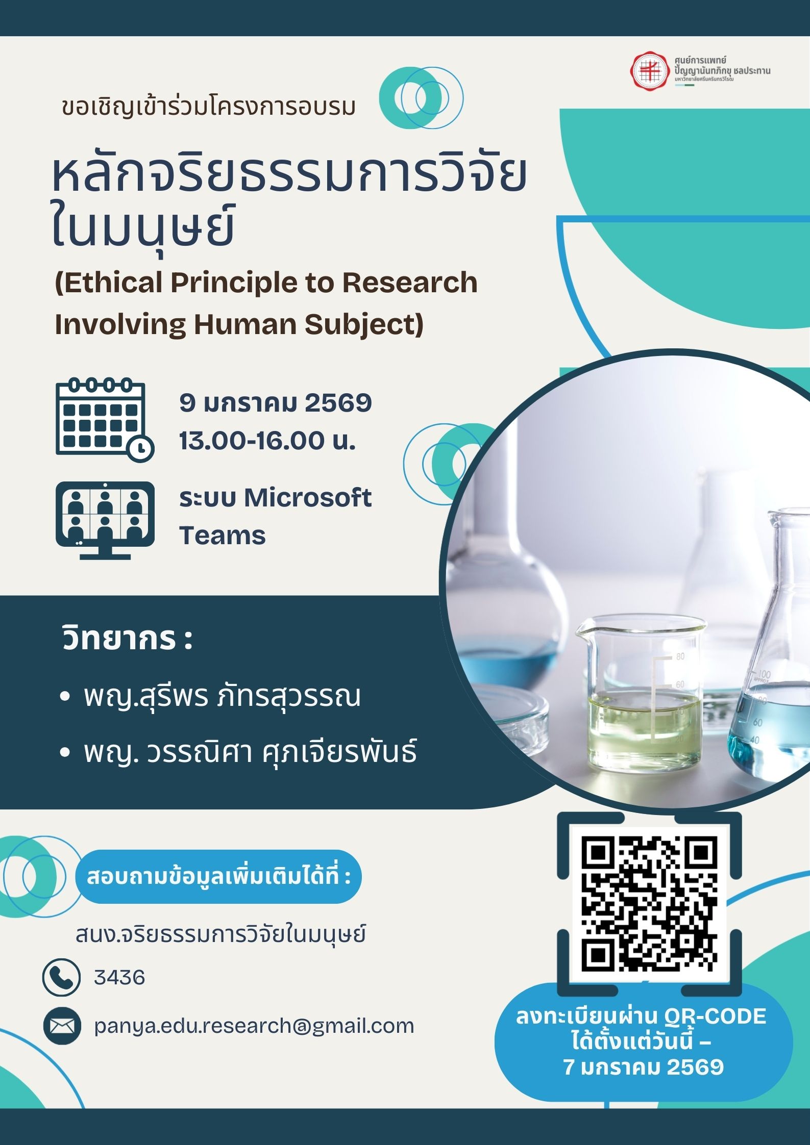 สำนักงานจริยธรรมการวิจัยในมนุษย์ ศูนย์การแพทย์ปัญญานันทภิกขุ ชลประทาน ขอเชิญเข้าร่วมโครงการอบรมออนไลน์ ผ่านระบบ Microsoft Teams ดังนี้