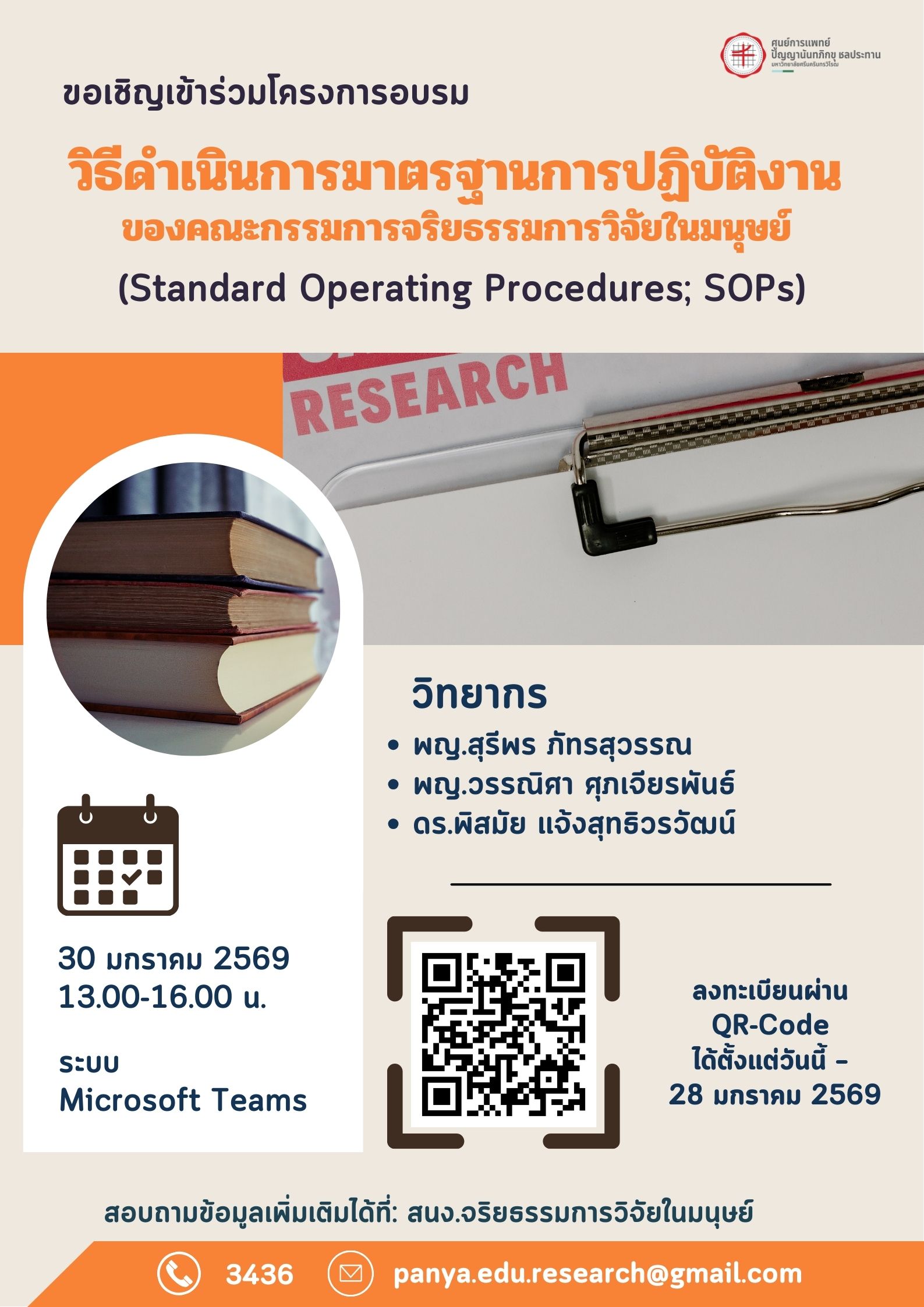 2. โครงการอบรมวิธีดำเนินการมาตรฐานการปฏิบัติงานของคณะกรรมการจริยธรรมการวิจัยในมนุษย์ (Standard Operating Procedures; SOPs) ในวันศุกร์ที่ 30 ม.ค. 2569 เวลา 13.00-16.00 น.